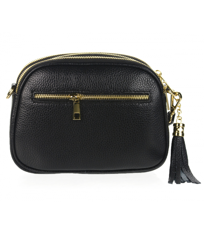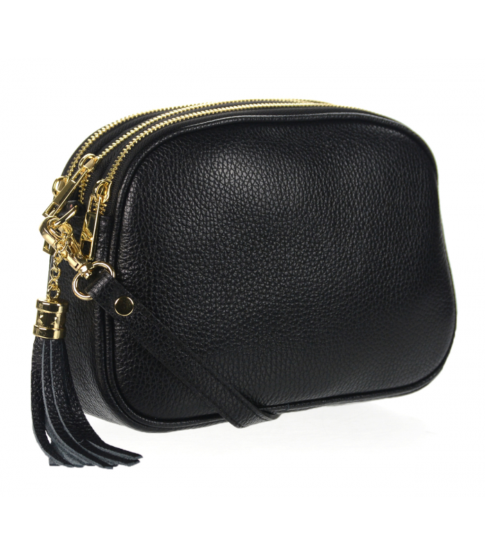 Kis fekete crossbody táska arany cipzárral és bojttal
